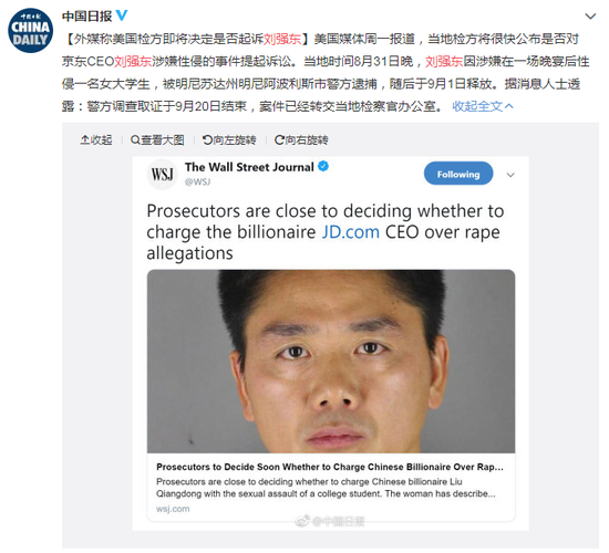 [转帖] 外媒称美国检方即将决定是否起诉刘强东 |