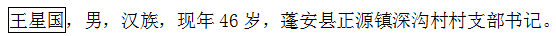 2018年9月3日下午,某建筑工程公司两名施工人员在清洗蓬安县正源镇深沟村“人饮工程”水井时因吸入毒气昏倒在井里,闻讯赶来的村支部书记王星国见情况紧急,顾不上村民劝阻,毅然跳入水井中救人,在第一个施工人员被成功救上地面后,还没来得及继续施救另外一位井下的工人,王星国就因吸入大量毒气而壮烈牺牲。