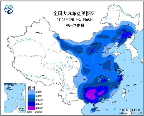 预计,12月25日08时至27日08时,内蒙古中东部、东北地区中南部等地气温将下降6~10℃,其中,吉林中西部、辽宁中部和西南部等地的部分地区降温幅度可达10~12℃,局地超过14℃,上述地区伴随出现4~6级风、阵风7~8级。