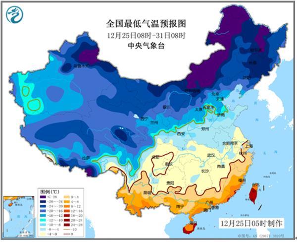 25日起最低温度0℃线将从黄淮地区逐步南移,28日至29日长江中下游沿江地区最低温度低于0℃,30日至31日最低温度0℃线到达华南北部地区。