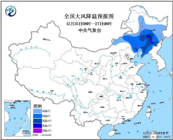 中国天气网讯 中央气象台12月25日06时继续发布寒潮蓝色预警:
