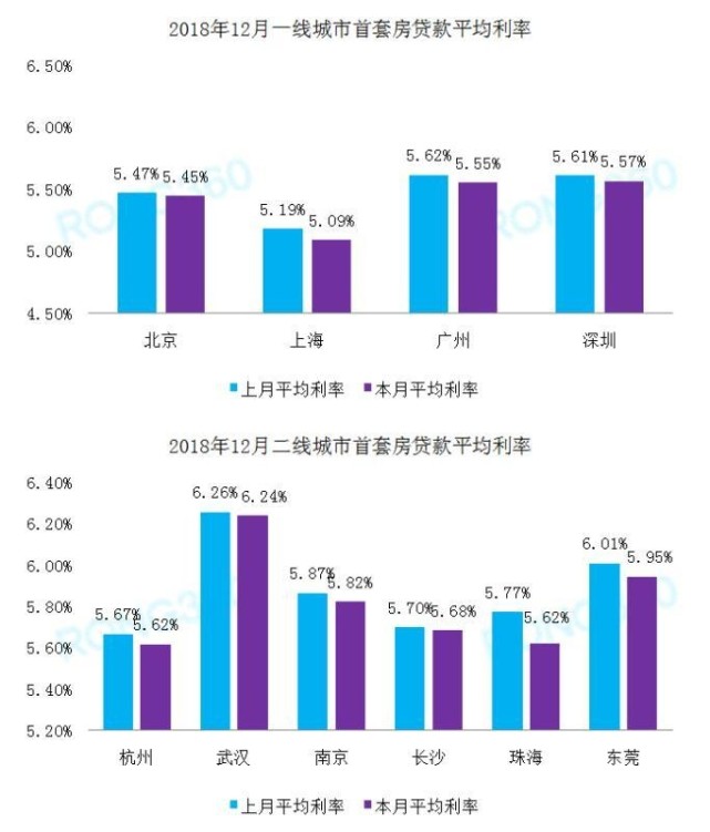 2016年12月至今,全国首套房贷款平均利率走势 图片来源:融360大数据研究院 一线城市首套利率集体回落 全国二套房贷利率连续两月回落 近日,多地传来“房贷利率松动”的消息,尤以一线城市最为突出。先是网传深圳部分商业银行下调房贷利率;后有上海地区实打实新增加5家银行首套最低可执行95折优惠、广州汇丰银行首套房仅上浮5%;北京地区近期虽无房贷利率调整,但目前执行的“基准利率上浮10%”的规定,较2017年同期也明显有所放松。 据融360统计,2018年12月共有17个城市首套利率均值出现回调,北上广深以及多数热门二线城市首套利率均值均有不同程度下降。一个月前,即2018年11月,四个一线城市中仅有广州、深圳首套利率回调。而在12月的全国首套利率最低排名中:上海位居第一、北京第四、广州第九、深圳第十,北京的排名较11月上升了2位次。 二套房贷款利率的回落比首套利率来的更早,融360大数据研究院监测数据显示,2018年12月全国二套房贷款平均利率为6.04%,较上月回落2BP,且已是连续两月出现回落,12月二套贷款平均利率环比下降0.33%。 12月武汉首套利率最高 全年哈尔滨上涨最多 遗憾的是,尽管房贷利率回调是大趋势,但似乎还未能传导向全国。融360大数据研究院监测数据显示,2018年12月武汉首套房贷款平均利率高居全国之首,较上月下降2BP的情况下,武汉首套利率为6.24%。