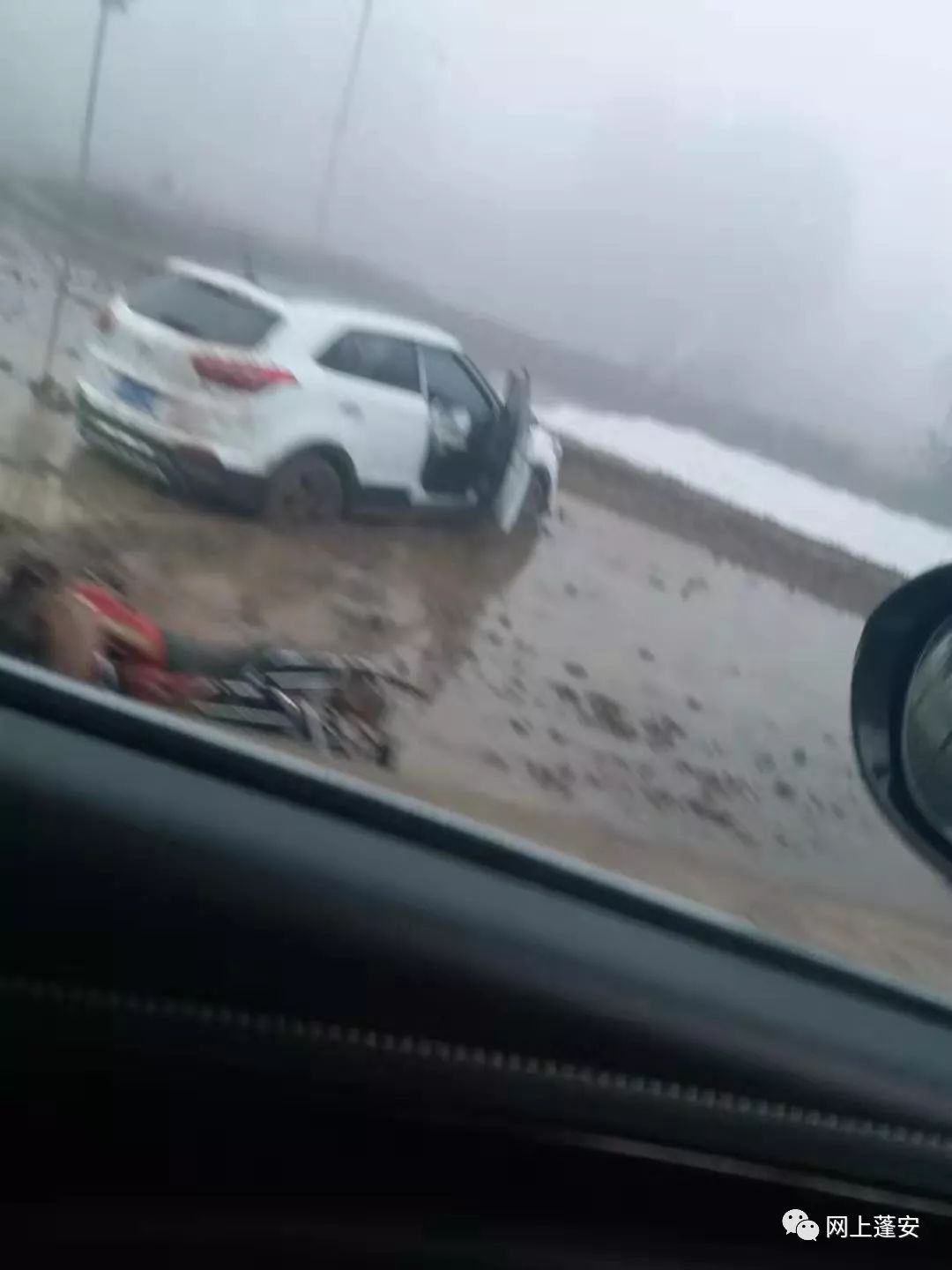 2019年3月18日上午,“晒黑了的小白脸”等多名网友向蓬安全搜索报料:“就在今天早上,蓬安金甲银龙桥附近的公路上发生了一起非常奇葩的车祸事故,一辆白色的小车竟然从公路上直接飞进了路边的水田里!一辆摩托车被撞倒了,倒在了公路边的水田里。摩托车被撞得都已经变形了,这个摩托车应该算是报废了。”