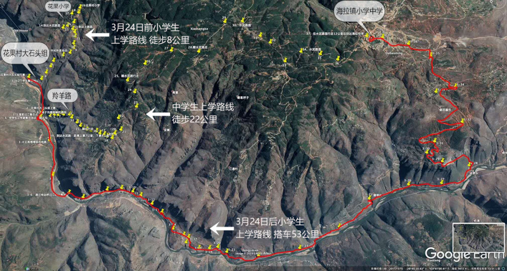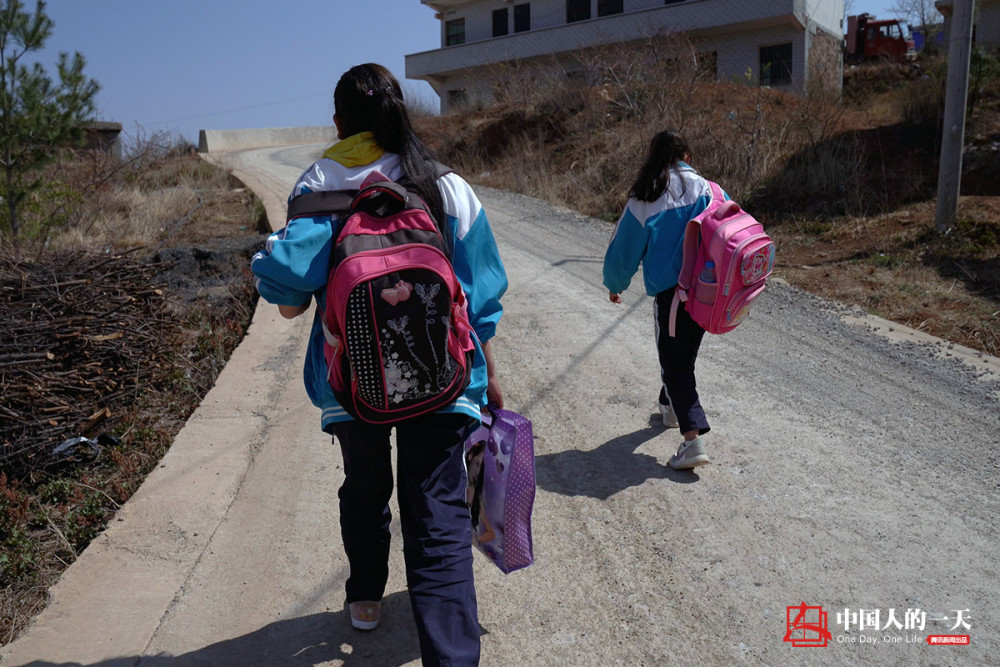 经过大约3个小时艰苦攀登,终于到达山顶的环山水泥路,因为没有通公交车,他们还需要顺着公路徒步13公里到达海拉中学,这段路程爬升高度大约300米,耗时约3小时,所以从家到学校单程要徒步5个半小时到7小时。如果是放学回家,因为一路下坡,比较省力,行程大约可以缩短到5个小时。
