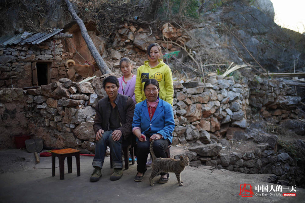 卯会琴、卯春坊姐妹和爸爸卯万乘、妈妈朱桃珍一起拍照。画面中,还有一家人喜爱的9岁土狗和1岁狸猫。卯会琴说,今年下半年可能易地搬迁到威宁县城,但是县城不能养狗,养猫没问题,所以搬迁时9岁的土狗不知道怎么办。卯会琴说,也许爸爸妈妈会暂时留在农村一段时间,到年底收获玉米和处理完家畜,再搬进城一家人团聚,但小狗也许最终只能托付给不还留在村里的人。卯会琴说,从小学开始把这只土狗养大的,感情很深,和它分开的时候,肯定会哭的稀里哗啦。