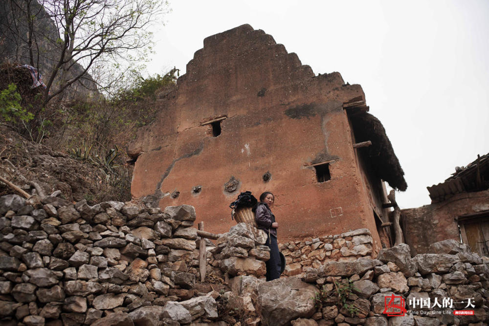 卯会琴每周回家,都会把积累一周的脏衣服带回去,洗干净再背到学校。加上爸爸妈妈的衣服,洗完的湿衣服装满了一背篓,大约有30公斤。在卯会琴的身后,是已经人走屋空的老房子。