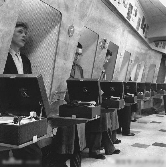 1955年,伦敦唱片店里顾客在隔音隔间里试听唱片。