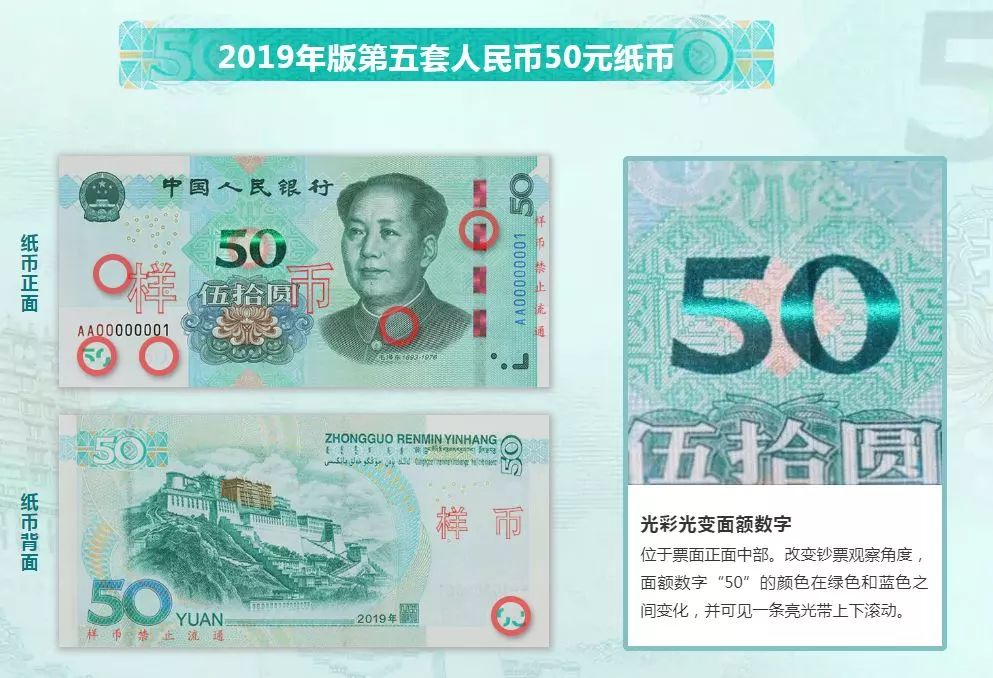 2019年版第五套人民币50元、20元、10元纸币票面中部印有光彩光变面额数字,改变钞票观察角度,面额数字颜色出现变化,并可见一条亮光带上下滚动。以新版50元为例,随着观察角度的改变,面额数字“50”的颜色会在绿、蓝之间交替变化。