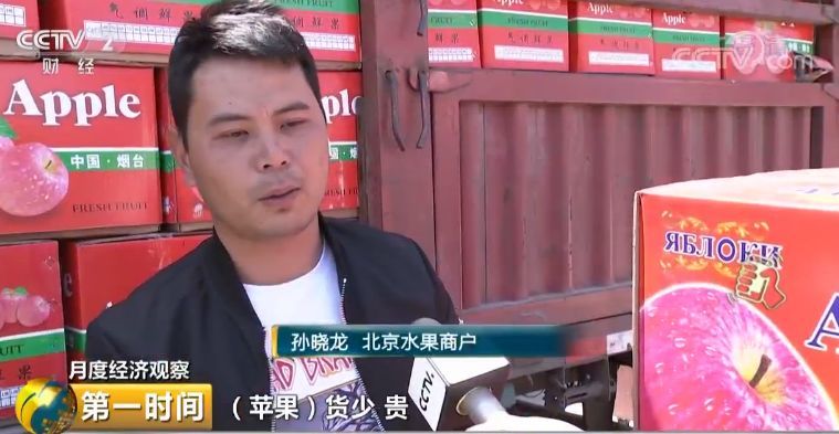 北京水果商户孙晓龙:苹果货少,现在一般每斤卖六元,贵了两元。