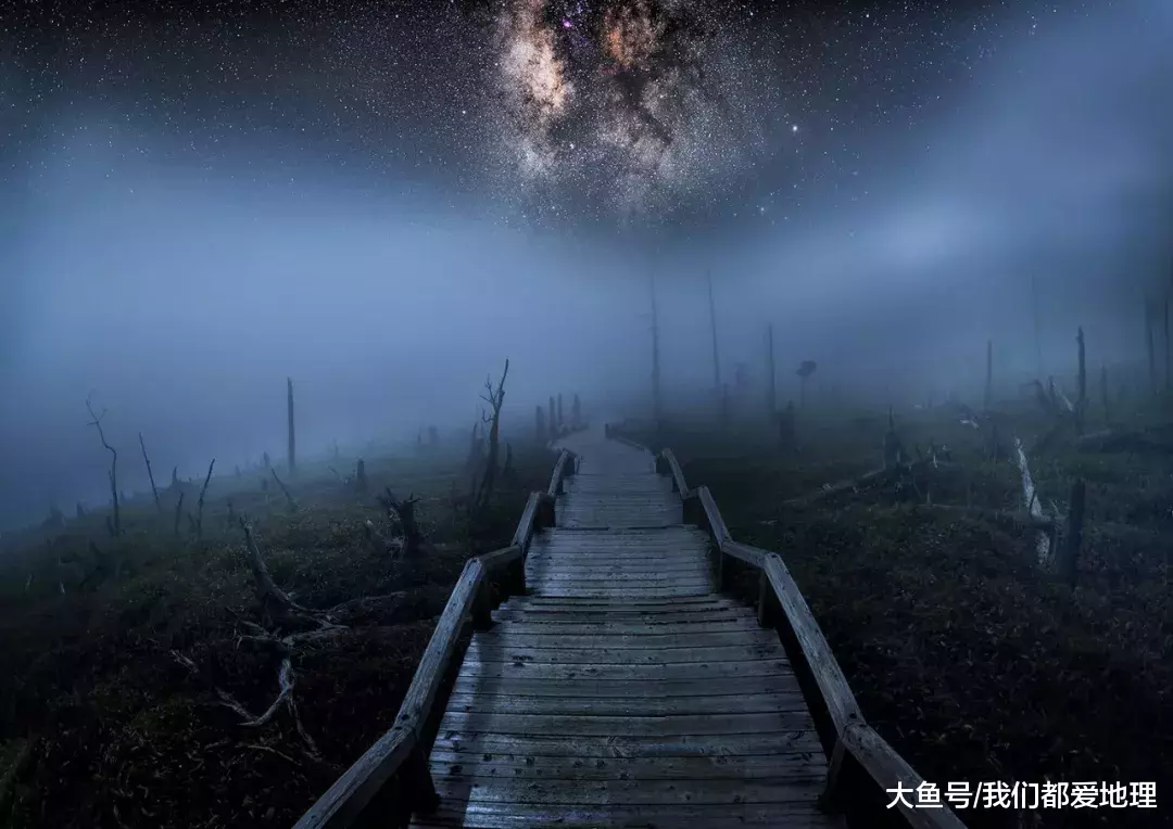 没有人的夜晚,浓雾笼罩的山顶,强风、黑暗,天空的雾被吹散,刚好拍到银河的中心