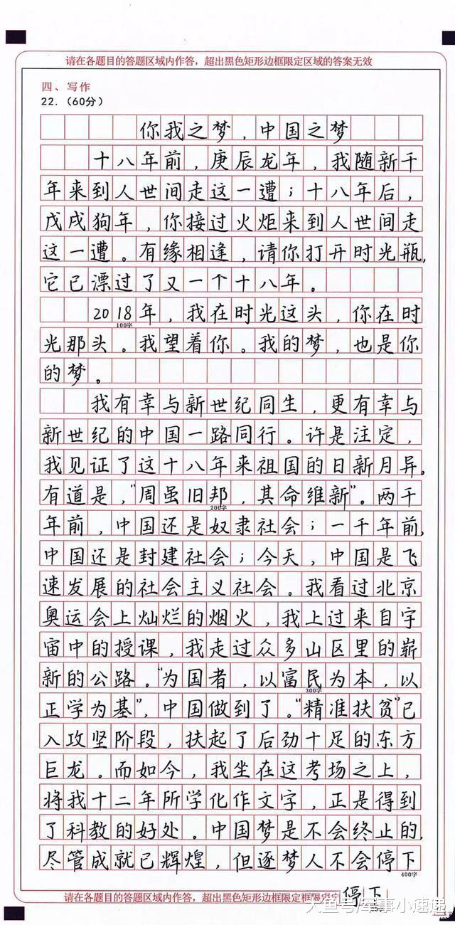 下面是2018届深圳中学温卓越同学的高考作文誊抄版,先不说他这篇高考作文才华怎么样,单是看着字迹就很让人满意了。他的作文题目是“你我之梦,中国之梦”,全文都描写了新世纪的中国面貌,并且有美好的展望之情。之所以说这篇文章是“印刷体”高考作文,是因为整篇文章首先是没有一个涂改,而且字迹大小,间隔都很适当,和印刷出来的字体没什么区别。这样一份有才华又字迹很好的作文自然是博得了阅卷老师的青睐,也相应获得了很好的分数。