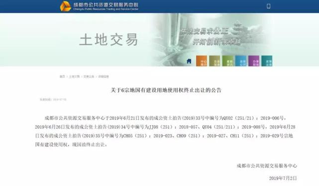 7月2日,成都市公共资源交易服务中心发布公告:6宗土地终止出让。