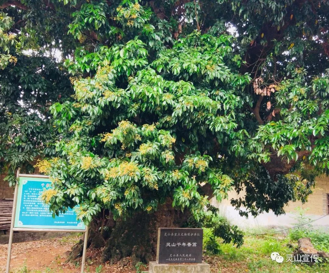 灵山县种植荔枝历史悠久,可谓“无荔不成村”。灵山不少地方自古就有一种习俗:无论哪家添男丁,都在住宅附近种几棵荔枝树,等荔枝挂果时,正是孩子长大后读书时,就有求学的资本。于是,就形成了现在古荔枝树随处可见的荔乡风韵,树龄在800年以上的香荔树就有1500多株。