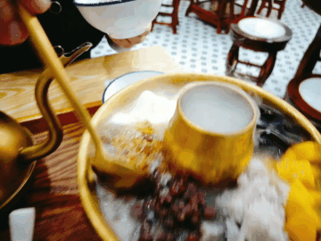 旦素!当它被端上来的时候,小编还是被有点小惊艳到,只见店内服务员将两个水壶往“火锅”内一倒,整个桌子上都充满了“仙气”
