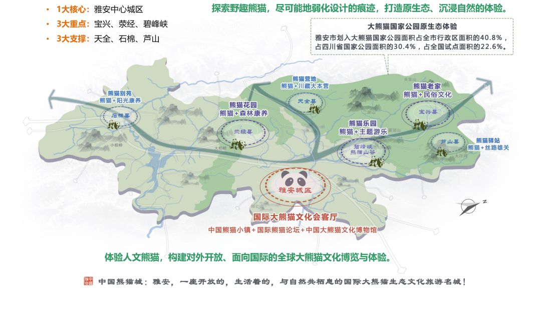 综上,以大熊猫国家公园建设为契机,以中心城区为文化体验核心,全域形成多个大熊猫原生态体验基地,建设中国大熊猫文化国际旅游目的地和大熊猫国家公园“园地协调”创新发展示范区,统筹生态保育、城镇发展、产业带动与乡村振兴,高质量推进雅安绿色发展示范市建设。