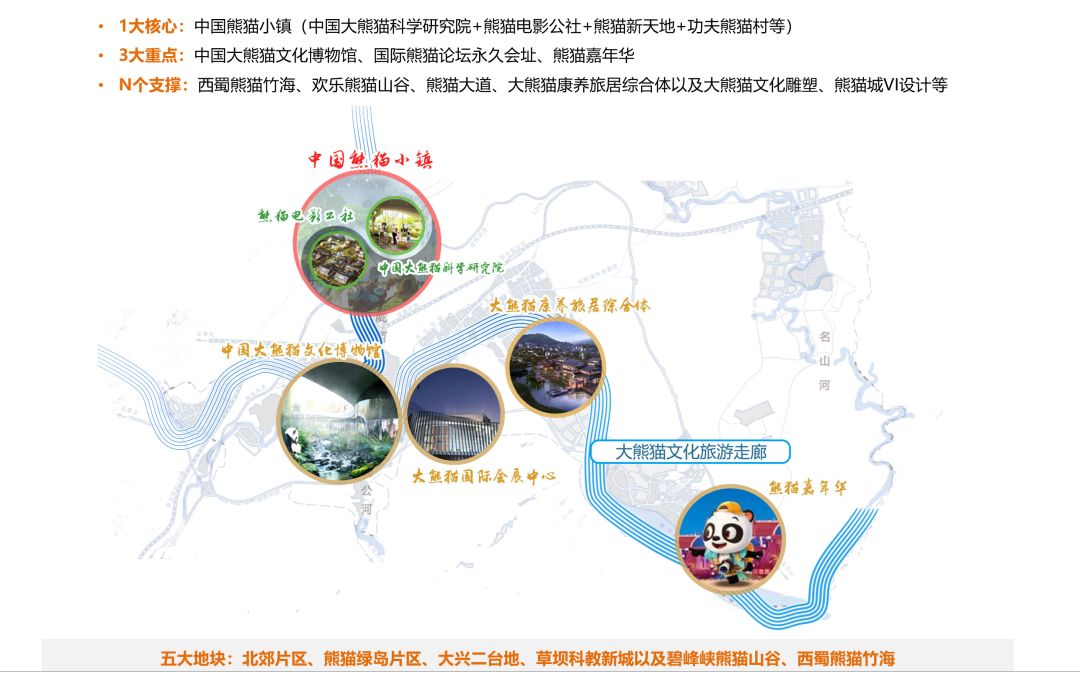 中心城区按照“景城一体”“文旅一体”“产城一体”的思路,以大熊猫为超级IP,推进原有城区的特色旅游化提升。