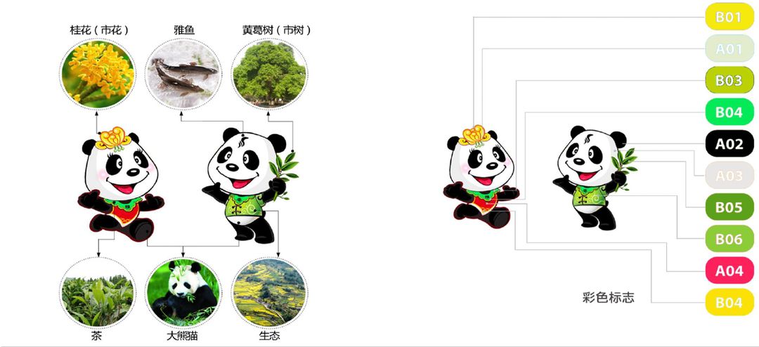 城市文旅吉祥物—雅雅、安安:创意设计吉祥物,是文旅城市营销推广的重要手段。雅安,从大熊猫这一具有国民吸引力的文旅要素切入,整合雅茶、雅鱼、雅竹等地方本土产业元素以及桂花等城市生活要素。