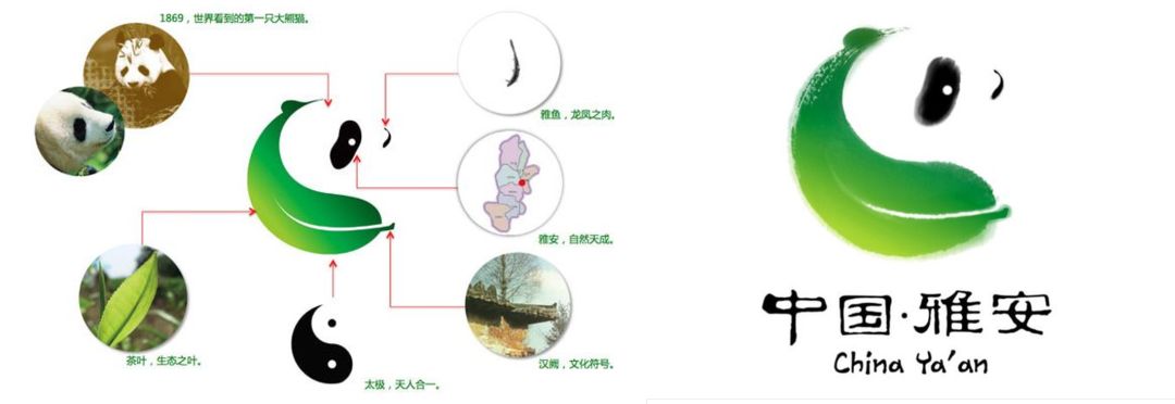 城市形象LOGO—水墨版:以熊猫和茶叶为核心设计元素,形似一副太极图,又神似大熊猫,更朦胧,更写意。一只黑白两色的大熊猫与一片绿色的茶叶分别代表了雅安最核心的文化要素和资源要素。