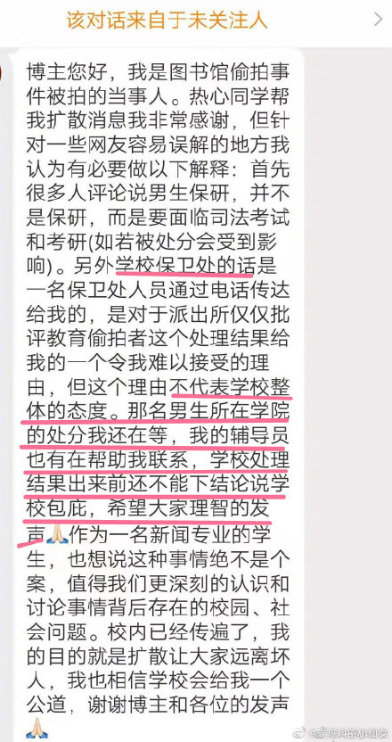 此外,还有消息称,事发后,该校保卫科并未对男生做出处罚,并向涉事女生解释称“男生家庭贫困,要考研,怕耽搁他的前途,希望被偷拍裙底女生理解一下,”