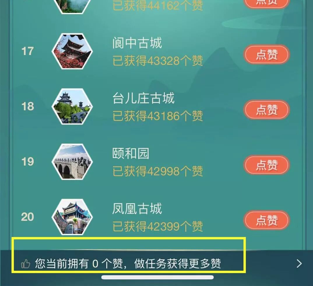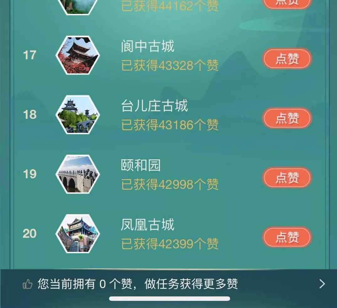 在候选菜单里向下拉,找到“阆中古城”,并点击“点赞”