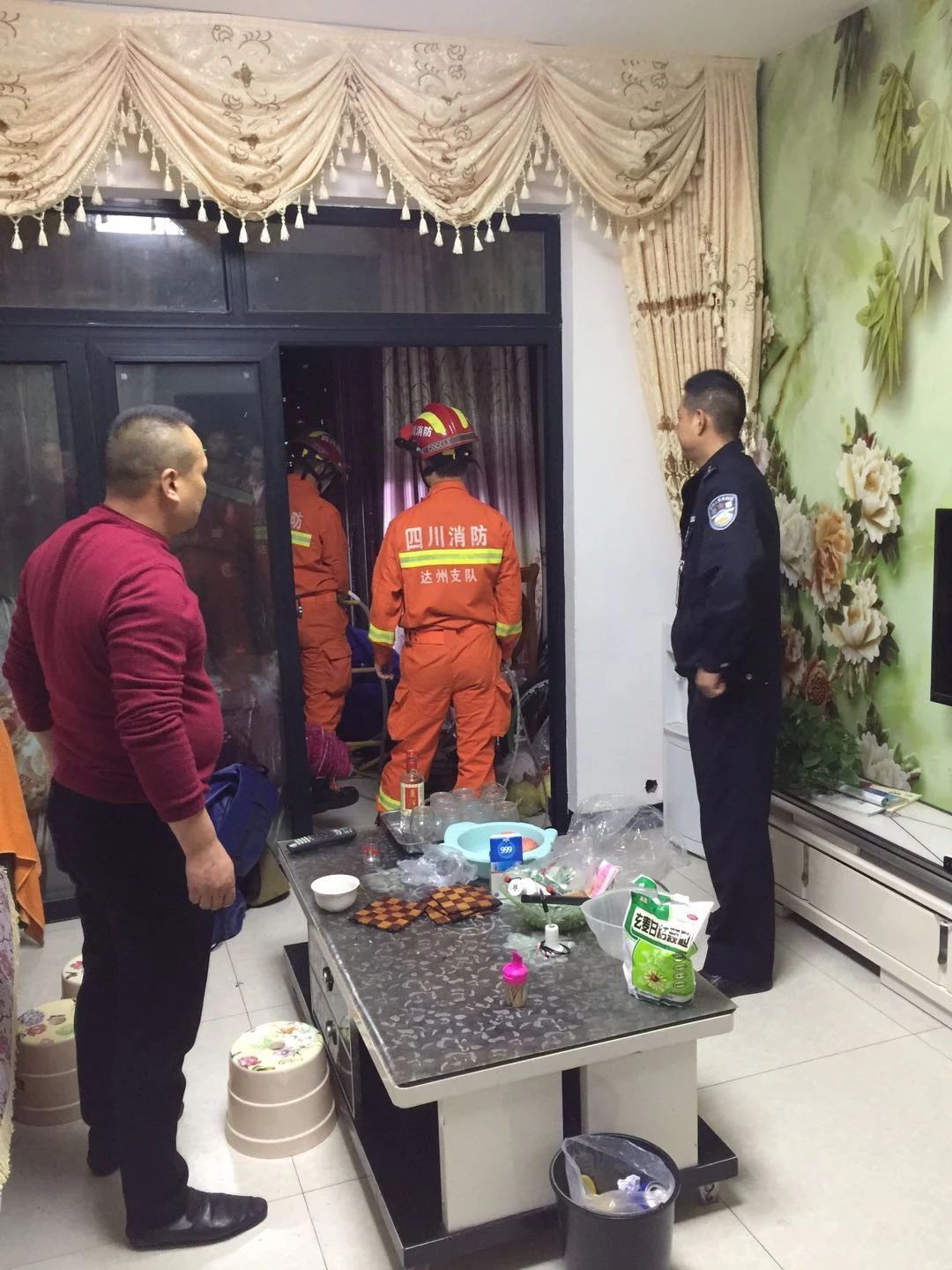 民警配合消防队员顺利将卡到7楼的两人救下