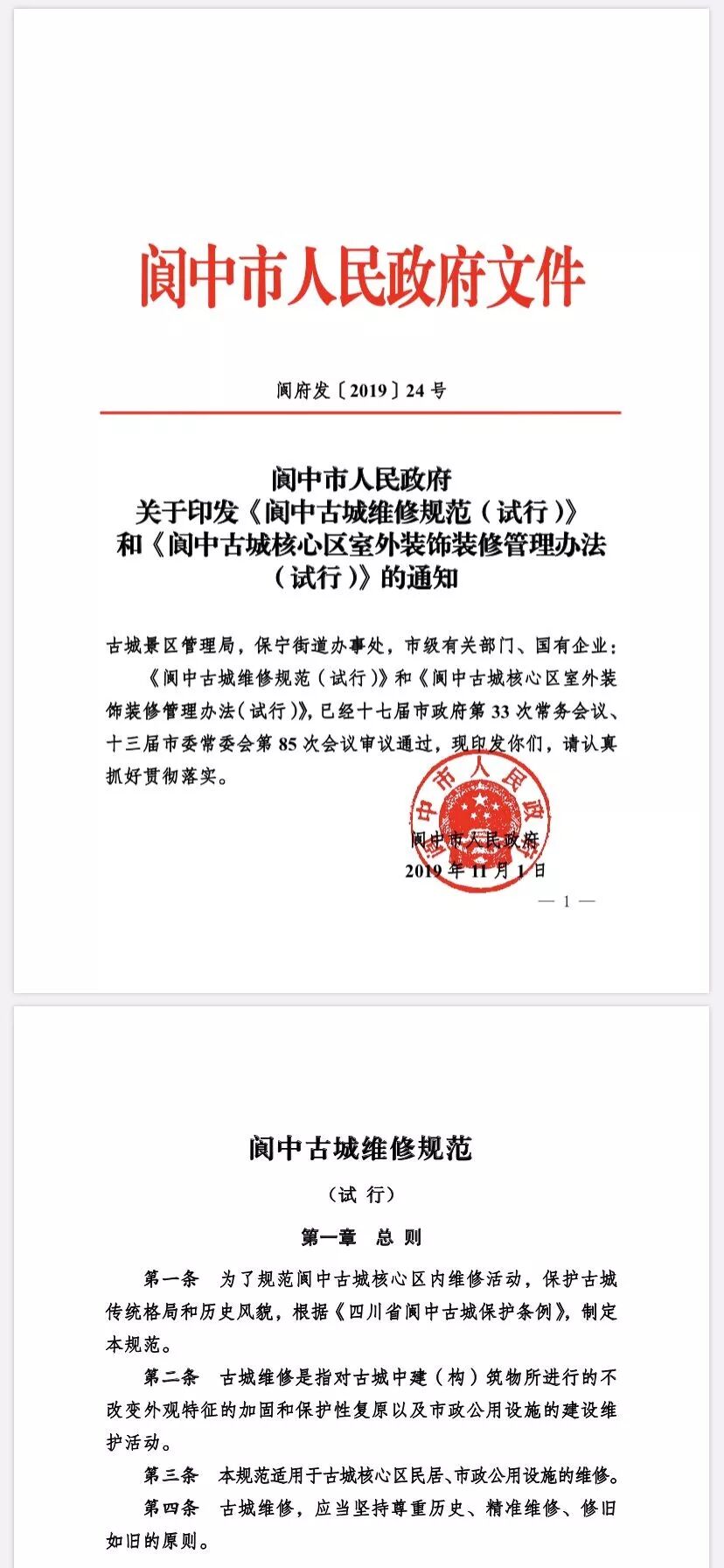《阆中古城维修规范(试行)》和《阆中古城核心区室外装饰装修管理办法(试行)》,已经十七届市政府第 33 次常务会议、十三届市委常委会第 85 次会议审议通过,现印发你们,请认真抓好贯彻落实。