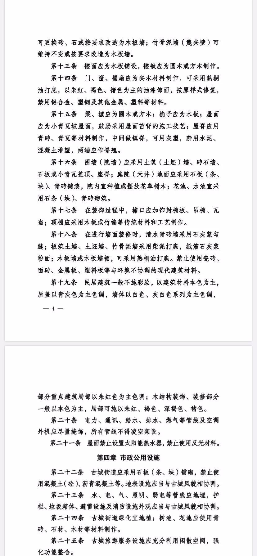 第十九条 民居建筑一般不施彩绘,以建筑材料本色为主,屋盖以青灰色为主色调,墙体以白色、灰白色系列为主色调,部分重点建筑局部以朱红色为主色调;木结构装饰、装修部分一般以本色为主,局部可施以朱红、褐色、深褐色、褚色。