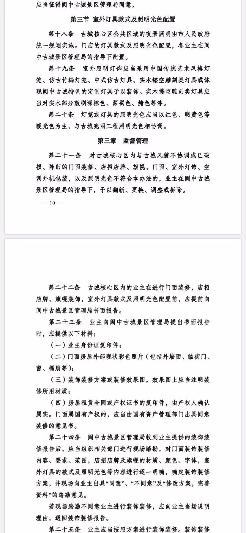 第二十二条 古城核心区内的业主在进行门面装修,店招店牌、旗幌装饰,室外灯具款式及照明光色配置前,应提前向阆中古城景区管理局书面报告。
