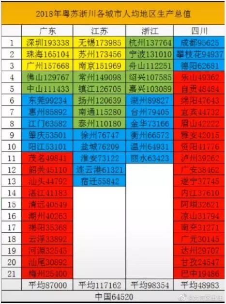 排在前面的咱们也不能太骄傲了,毕竟我们都还是西部城市,发展相比沿海还是有差距。甚至对比全国人均GDP,我们只有攀枝花、成都、德阳三个城市超过平均线。