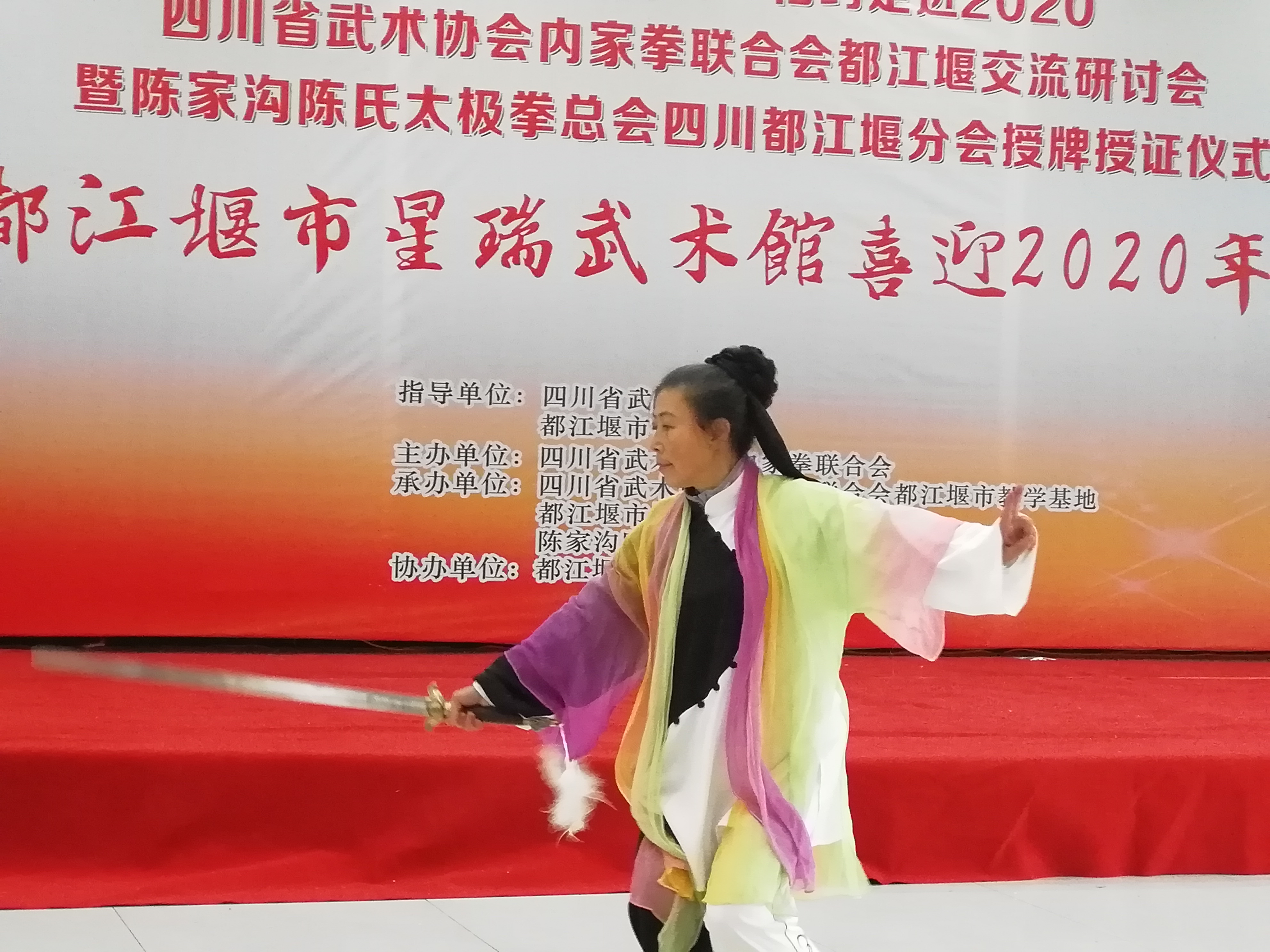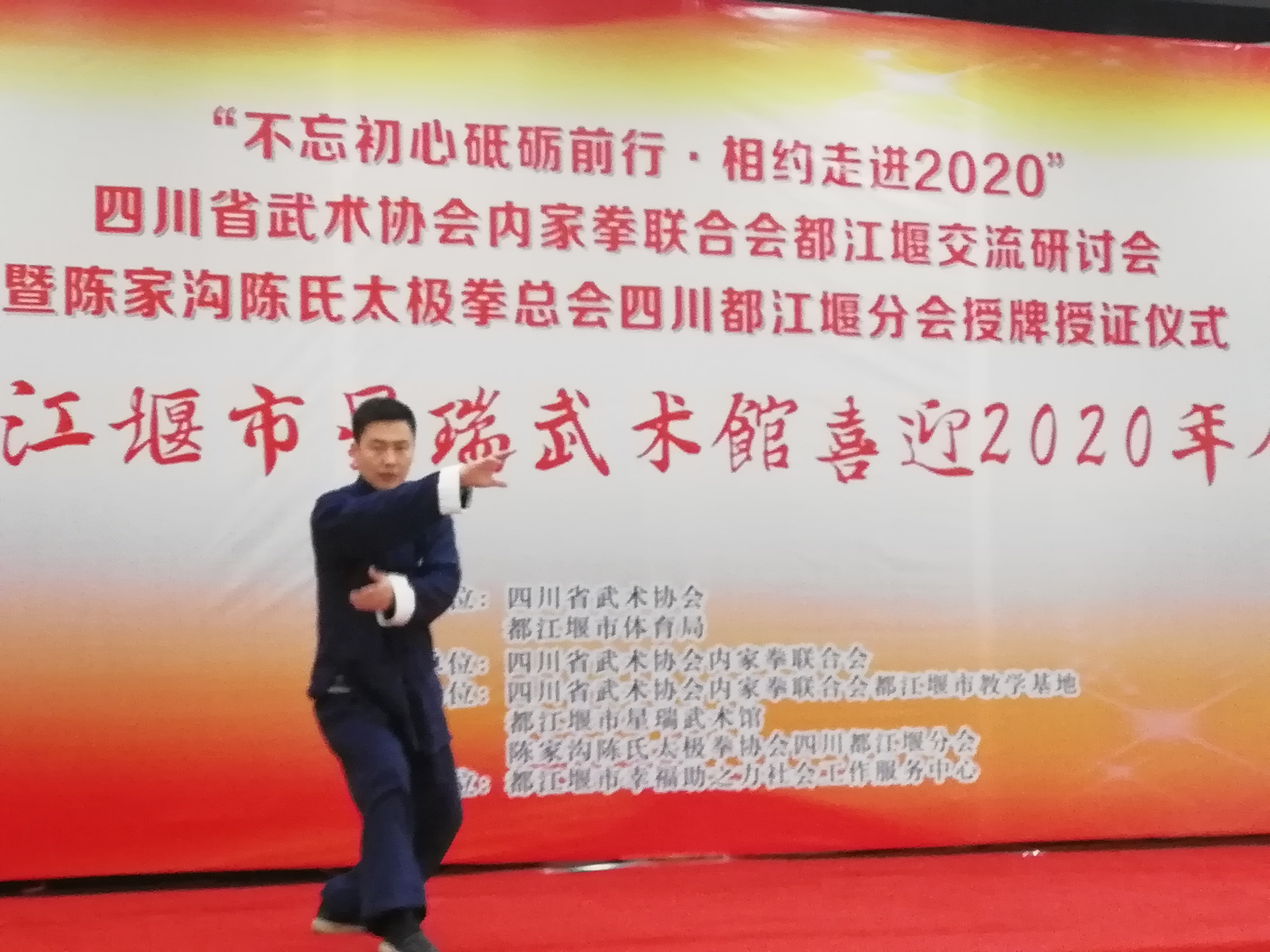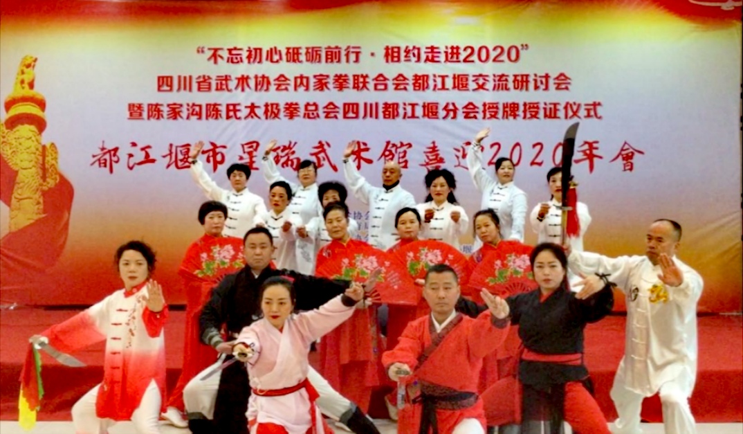 传尚武精神,承中华武魂;今天我们中华龙的传人们,武术名家们以及热爱武术的广大太极拳爱好者们,在此刻汇聚一堂,喜迎新年,共享这武林盛会,让我们携手迈步,一起走进2020······ 2019年12月26日上午九点整“不忘初心 砥砺前行——相约走进2020”四川省武术协会内家拳联合会都江堰交流研讨会暨陈家沟陈氏太极拳协会四川都江堰分会和都江堰市星瑞武术馆喜迎2020年会在都江堰市“瀚园酒家”隆重举行。 活动在一曲嘹亮的《国歌》声中正式开始。 都江堰市星瑞武术馆表演的武术《龙耀中华》拉开了本次活动的序幕。 开幕式上,四川省武术协会主席肖家泽先生、四川省武术协会内家拳联合会秘书长邹樑正先生在会上作了热情感人的讲话、并对都江堰市星瑞武术馆一年来在四川武术事业中所做的突出贡献做了充分的肯定。 四川省武术协会巴蜀武术研究会会长黄天才也为大会作致词。 大会上来自 四川省众多当代武术名家们在本次活动中也一展示武术风采。 三山道长许成钧为大家展示了武当阴阳混元掌 黎门太极拳创始人黎光晋为大家展示了黎门太极拳 秘宗传人高来全为大家展示了形意杂式锤 武术名家陈洪广为大家展示了太极八卦剑 洪式太极拳传承人李秋虹为大家展示了洪式太极拳 绿林武术学校校长黄德善为大家展示了杨式太极拳 白猿通臂拳掌门人曹斌为大家展示了白猿通臂拳 号称“醉太极”的钟家斌先生也为大家展示了杨式太极拳 杨式太极拳传人欧巧陵为大家展示了武当游龙八卦剑 陈氏太极拳陈小旺宗师入室亲传弟子,陈小旺太极拳法代表性传承人乔卫星先生为大家展示了陈氏太极拳 大会中四川省武术协会内家拳联合会都江堰基地的各个太极单位也纷纷上台交流展示他们的精彩表演 联盟太极分会展示的《传统杨式太极拳》 聚源星瑞武术运动中心展示的《拳剑表演》 成都星瑞辅导站展示的《桃花太极扇》 都江堰市星瑞武术馆展示的《太极推手》表演 陈长义小架四川分会展示的《陈氏小架》表演 青城桥太极队展示的《杨式太极拳》 园林太极拳队展示的《太极拂尘》 都江堰市星瑞武术馆展示的《陈氏太极拳》 分别颁发了“优秀团体单位表演奖”“优秀教练奖”“优秀领队奖”“优秀个人风采奖”