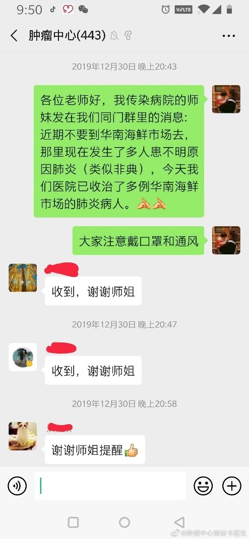 “各位老师好,我传染病院的师妹发在我们同门群里的消息:近期不要到华南海鲜市场去,那里现在发生了多人患不明原因肺炎(类似非典),今天我们医院已收治了多例华南海鲜市场的肺炎病人。大家注意戴口罩和通风。”