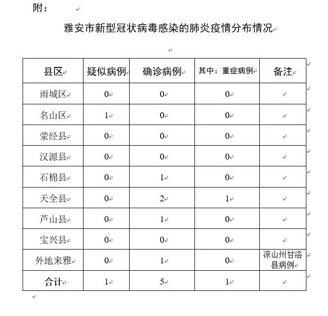 一、新增疑似病例情况李某,23岁,男,雅安名山人,无武汉旅居史, 1月22日与确诊病例陈某(芦山确诊病例)同乘动车。1月27日出现“发热,咽痛,流涕,咳嗽”等症状转雅安市定点医院就诊,2月1日被诊断为新型冠状病毒感染的肺炎疑似病例,目前病情稳定。二、确诊和疑似病例相关情况2月1日0-24时,雅安市新增报告新型冠状病毒感染的肺炎疑似病例1例,无新增确诊病例。截至2月1日24时,我市报告新型冠状病毒感染的肺炎确诊病例5例(1例外地来雅病例、1例重症病例),疑似病例1例,以上病例均在接受隔离治疗,除重症病例外其余病例病情稳定。三、返雅群众排查情况市卫健委和8个县(区)组织人员对武汉返雅群众进行排查,截至2月1日24时排查到位4727人。累计追踪到密切接触者并接受医学观察300人,正在接受医学观察267人,已解除医学观察32人。