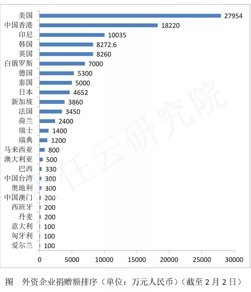 中国社科院钟宏武教授、责任云研究院执行院长叶柳红、研究员陈思颖、张阳光、周媛媛、陆烨、柳梦笛通过全网统计发现: 截至2020年2月2日,188家外资企业捐赠10.96亿元,美国、中国香港、印尼、韩国、英国的企业捐赠额暂居前列。1月31日至2月2日的3天中,来自美国、中国香港、韩国、荷兰、日本的企业新增捐款最多,共计1.66亿元。新增大额捐赠包括中国三星3000万,飞利浦(中国)1500万,以及SK中国、安利、NBA、历峰集团、沃尔沃、Honda、朗新科技均捐赠1000万。 (本文也得到中国社会责任百人论坛发起人、全球报告倡议组织GRI董事局董事吕建中博士的信息支持)。