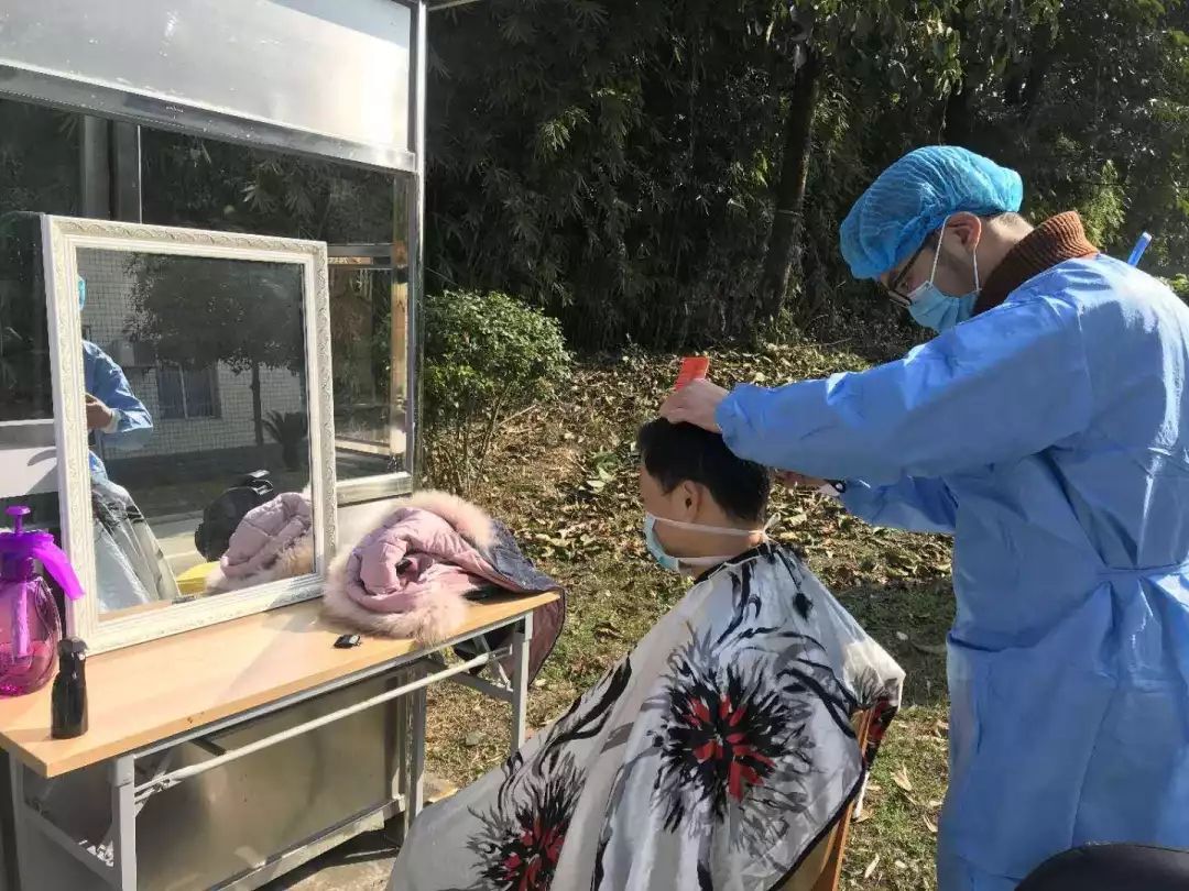 从当天上午到下午4时许, 来自南充的发型师曾富身穿防护服在现场一一为医疗人员剪发,看着医疗人员为了抗击疫情,连头发也顾上理,他十分心痛也很难过,在剪发时他特别认真,也希望全力为医疗人员留下美好的形象,可是考虑到隔离区防止感染的要求,他只能按要求为女医护人员剪短发,为男医护人员多剪寸头或是光头。对此,他一再表示歉意,而医护人员均表示,疫情当前,救治病人远比形象重要。