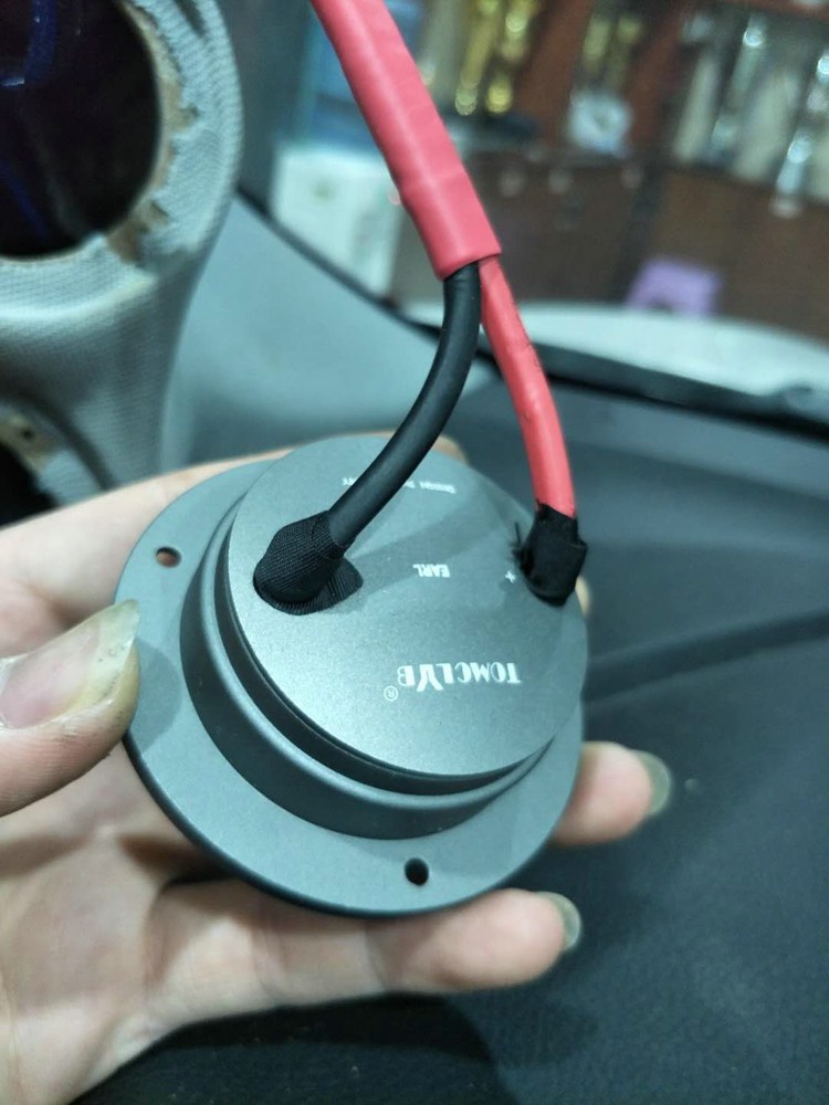 将TOMCLUB堂口EARLseries6.3伯爵三分频套装喇叭的高音单元和中音单元倒模安装在汽车的A柱上。