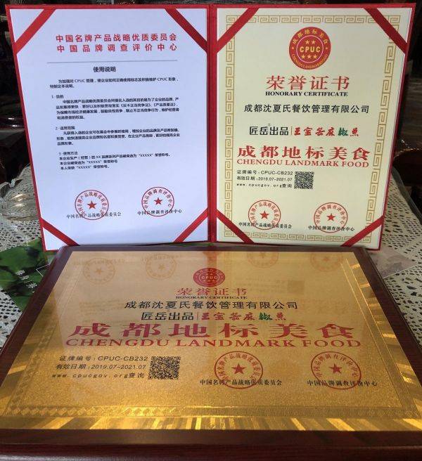2019年7月25日,中国名牌产品战略优质委员会和中国品牌调查评价中心联合在北京举办了中国各城市地标美食评选活动,在本次活动中依据中国品牌调查评价中心《地标美食评定标准》,由该中心多位行业资深专家初审后,经组织专家考察评审,结合大量市场数据,从全国参选的数十家美食品牌中评选成都沈夏氏餐饮管理有限公司旗下匠岳出品“王宝器麻椒鱼”为“成都地标美食”荣誉称号,现场进行公示,并颁发牌证。