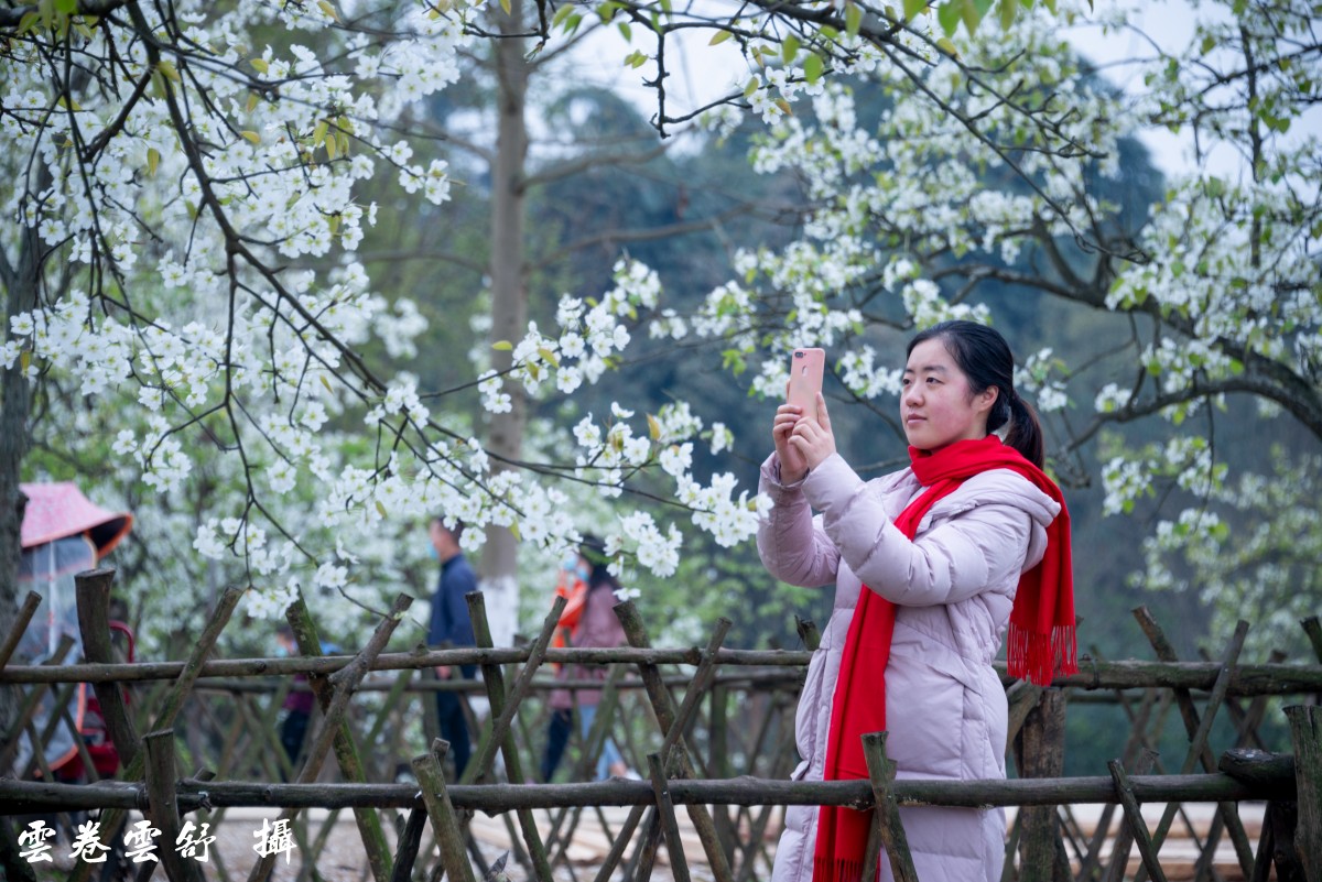 拍照片的人都有这样的感觉,如果只拍梨花,画面会很单调,但画面中有了人立即就灵动而有生气了,所以花美还需人衬托、人美也需花打扮,相得益彰是最好的!