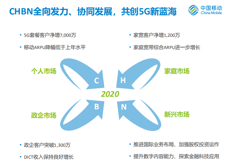 3月27日消息,据中国移动给出的最新2020年CHBN具体目标来看,今年他们要把5G套餐客户净增7000万,当然用户的增加不会建立在5G套餐价格战上。 中国移动方面表示,2019年公司顺应形势变化,从通信服务向空间更广阔的信息服务转型升级,启动实施了个人、家庭、政企、新兴“四轮”市场全向发力、协同发展的战略转型,收入结构进一步优化,新动能持续增强。 个人市场方面,2019年移动客户净增2521万户,达到9.50亿户。手机上网流量同比增长90.3%,手机上网DOU达6.7GB。移动ARPU为人民币49.1元,保持行业领先。 家庭市场方面,家庭宽带客户达到1.72亿户,同比增长17.1%。其中,“魔百和”用户达到1.22亿户,渗透率达到70.9%。家庭宽带综合ARPU达到人民币35.3元。 中国移动同时明确2020年CHBN“四轮”发展具体目标:5G套餐客户净增7000万户(2019年末为255万户);家庭宽带客户净增1200万户(2019年末为1.72亿户);政企客户突破1300万户(2019年末为1028万户);与此同时,推进国际业务布局、加强股权投资运作、提升数字内容能力、探索金融科技应用。 报告显示,2019年中国移动资本开支为人民币1659亿元,其中5G相关投资为240亿元。2020年公司将加速推动SA成熟,积极推进5G网络建设。2020年资本开支预算为1798亿元,其中5G相关投资计划约1000亿元。 据了解,中国移动力争2020年底5G基站数达到30万,确保在全国所有地级以上城市提供5G商用服务。最新数据显示,截至今年2月底,中国移动5G基站数已经超过8万个。 事实上,在这之前,中国电信和中国联通也表达了相应的观点,即5G套餐上不打价格战,希望全行业共同推进共建共享,共同维护行业生态,共同繁荣5G产业。 从中国移动和中国电信首次官方公布了5G套餐用户数来看,两家合计2056.9万,其中中国移动5G用户数为1539.9万,2月当月净增866.3万,而截至2月底中国电信5G套餐用户数累计1073万户。