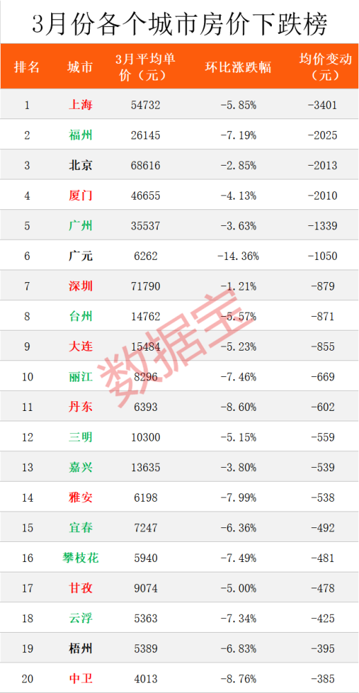 从环比跌幅来看,广元3月份二手房均价跌幅最大,达到14.36%。另外中卫、丹东、雅安等城市二手房均价跌幅均超过8%。70个大中城市中,丹东跌幅居首,达到8.6%。另外,福州、上海、厦门、大连等城市位居跌幅榜前列。