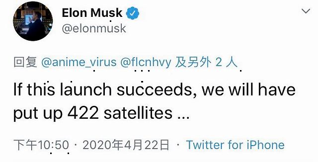 本次发射前,SpaceX创始人马斯克在推特上回复网友,“如果今天发射成功,我们在太空上将有422颗卫星……”2018年2月,SpaceX将两颗测试卫星Microsat-2A和Microsat-2B送入太空。去年5月,“星链”首批60颗卫星上天,SpaceX开启大规模部署阶段,至今发射7批,每批60颗。