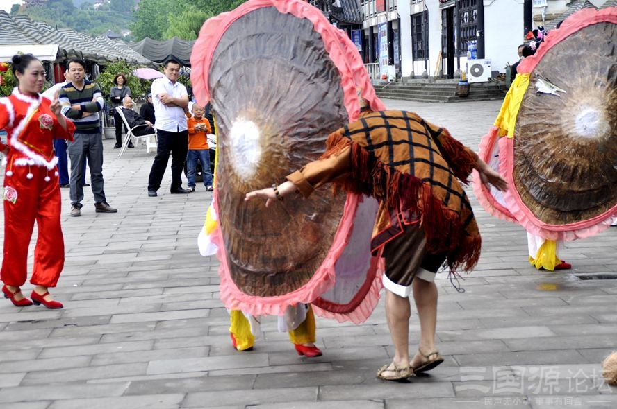 夸张而滑稽的妆容,幽默而诙谐的表演,独特而有趣的造型,演员仅一渔夫、一蚌壳精、两小蚌精,演出道具亦仅一竹篾编制纸糊而成的蚌壳以及一渔网而已,蓬安蚌舞的剧情亦非常简单,整个表演过程没有任何对白,演员只是通过丰富的面部表情和夸张的肢体动作来表现剧情,尽管如此,但却依旧高潮迭起,精彩纷呈,常常引得众人纷纷围观并捧腹大笑不已。 其实,蓬安蚌舞的历史非常久远,从明朝末年便流传于蓬安民间了,流传至今已有三百多年历史了。主要流传于蓬安县兴旺镇一带,一般也只在逢年过节和丰收喜庆之时表演,以欢庆节日庆祝丰收,表达劳动人民对国泰民安、五谷丰登、六畜兴旺、风调雨顺、美好生活的无限追求与向往之情怀。 现在能够表演蓬安蚌舞的人已经不多了,细细寻思起来,能够真正表演好蓬安蚌舞的演员应该也就只有原来的蓬安县兴旺镇火把剧团的几个尚还健在的老人了。 记忆中,三十多年前的老家兴旺镇有一个非常出名的民间剧团,名叫“兴隆火把剧团”。因为乡镇一到晚上常常停电,因此剧团演出的时候,便在戏台的周围插上几只长约尺余的竹筒,竹筒里注上煤油,再堵上一团棉布,点燃,照得四周一片灯火辉煌,演员便在台上咿咿呀呀地唱和表演,演出的剧目有《白蛇和许仙》、《梁山伯与祝英台》等等古装戏,但更多的时候是演出革命样板戏《红灯记》、《智取威老虎山》、《沙家滨》等等,三乡四里赶来观看演出的人便挤在台下人山人海地看。那时候,兴隆火把剧团里有很多年轻靓丽的女演员,其实很多人并非只是前来看戏,更多的人其实是跑来看美女。那时乡村里也几乎没有电视电影可看,于是便只好一次又一次地反复地观看这些剧来打发和消遣无聊的时光,看了一场又一场,仿佛丝毫也没有感到厌倦一般。 后来,很多年过去,随着时代大潮的冲击,曾经在家乡兴盛至极的火把剧团也随之而垮台了。剧团的演员们也如昨日流星一般,散落在岁月的星空之中了。现在能够表演蓬安蚌舞的演员,其实也就是那时兴隆火把剧团的一些演员们,现在的她们基本上也都老了,虽然老了,但是只要一表演起蚌舞来,却依旧青春焕发,激情似火,活力四射,也只有在表演之中,在她们的身上,才又可以看到她们曾有的年轻,曾有的美丽,曾有的风华绝代与风姿绰约。 2009年7月,蓬安嘉陵第一桑梓创建国家AAAA级旅游风景区迎省检,在蓬安龙角山画圣广场,我曾又有幸亲眼目睹了这样一场精彩纷呈的蓬安蚌舞的表演。随着一阵“咚咚呛,咚咚呛”的川剧锣鼓响起,蚌舞里扮演老渔夫的演员便首先出场了,老渔夫一出场,那夸张而滑稽的妆容便引得满堂观众哄堂大笑。只见老渔夫的鼻梁上画着白色的油彩,脸庞涂得大红大紫,下巴上挂着一部花白的胡须,仿佛马戏团滑稽剧里的小丑一般。只见头戴黄色凉帽的老渔夫,上穿大红古装,下穿绿裤,腰系一条白色围裙,肩上搭着一张破破烂烂的渔网,一瘸一拐地走,东张西望地四处打量,一路走,一路不时地将渔网撒向空中捕渔。说时迟,那时快,只见一个身穿大红袄,头扎大红帕,身披乌黑蚌壳的“蚌壳精”也登场了,“蚌壳精”躲在蚌壳之中,真没想到扮演“蚌壳精”的演员居然竟是我的海田同乡和街坊邻居康桂芳女士,多年不见,真没想到我记忆之中曾经年轻美丽的乡邻,如今竟然已是年逾六旬的老人了,康桂芳的丈夫名叫吕科龄,曾是我父亲在缝纫社当裁缝时教过的徒弟。扮演“蚌壳精”的康桂芳女士虽然年龄大了,但身手却依旧非常矫健,她将身子躲在蚌壳之中,两手各执一张蚌壳一张一翕,腾跳躲闪,俨然一个久闯江湖武功高强的侠女一般,让人简直不敢相信她如今已是年逾六旬的老人。只见老渔夫的渔网向东边撒来,扮演“蚌壳精”的康桂芳女士便迅速地向西边躲去,老渔夫的渔网向西边撒来之时,她又迅速地向东边躲去。老渔夫气急败坏之中,却又丝毫奈何不得。正在此时,两个头扎大红包帕,身穿黄袄黄裤,身披黄色披风的“小蚌精”也登场前来助阵了,三个 “蚌精”居然一起戏弄起老渔夫来了。只见“蚌壳精”故意吸引老渔夫注意力,老渔夫便将渔网向“蚌壳精”撒去,满以为会有巨大收获,谁知“小蚌精”却在背后偷袭老渔夫,老渔夫不幸跌倒在地,“蚌壳精”迅速围上前来,用大大的蚌壳去夹老渔夫的屁股,夹得老渔夫躺在地上“哇哇”直叫,引得众人哄堂大笑。 待到老渔夫好不容易从地上爬将起来,狡猾的三个蚌精却又迅速逃开。老渔夫不断撒出渔网,但却总是屡屡捕空,即使偶而侥幸捕得一只“小蚌精”,另外两只“蚌精”就会马上赶上前来偷袭老渔夫,当老渔夫气愤地又转身去对付两外两只“蚌精”之时,被渔网网住的“蚌精”则又乘机逃脱,如此这般,老渔夫顾此失彼,叫苦不迭。如此反复,引得众人又是阵阵哄堂大笑。 最后,戏弄老渔夫不断得惩的“蚌壳精”愈来愈骄傲,也越来越放肆大胆地去戏弄老渔夫,自以为是的“蚌壳精”最终被老渔夫用渔网网住了,另外两只“小蚌精”见势不妙也吓得落荒而逃了。 在观众热烈的掌声中,表演结束了,意犹未尽的观众们依旧久久不愿离去。表演蚌舞的演员们平静地坐在僻静的角落里喝水休息,情绪却很是低落,演员们大都怅然若失地东张西望着什么。知情人说,现在的年轻人大都出去打工挣钱去了,很少有人愿意再学蚌舞表演了,由于一直没有找到演蚌舞的传人,每次表演过后,面
