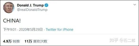 新冠可以摔锅给中国,警察暴力执法搞死了非裔,虽然甩不了锅,但对中国发发狠,飙飙硬话,转移下注意力,总可以吧?所以,昨天,眼看人民内部矛盾要升级之际,川普发了一条令网友喷饭的推特。“CHINA!”https://mmbiz.qpic.cn/mmbiz_jpg/2gHMRgK6WibQho4r6WPjfQy7u1ZLFJACfdt2iaJLn3eFc3LLRZcfbxiclv5QGkNx4YdSfFhkUjN5rcm4GpCOltufw/640?wx_fmt=jpeg不仅加感叹号,而且还全是大写的,没头没脑的一个单词,剩下全靠民众自己脑补推理。可惜,虽然特朗普很想分散火力,一会发推CHINA,一会退WHO,一会制裁HK,一会力挺国民警卫队……怎奈上述这些事只有美国政客关心,普通民众根本不关心,警察暴力执法那几分钟视频给大家带来的震撼太大,所以全社会的舆论火力被集中到了一个群体身上。所以,昨天发布会,特朗普迟了数十分钟,终于硬着头皮,上来喷了一柱香的时间,并且不接受任何记者提问,灰溜溜的闪电离场。内容还是那些老生常谈:什么世界卫生组织拿着美国十倍于中国的钱,不帮着美国说话,绝交。中国对港政策强硬,要取消对港优惠政策。China bad!