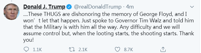然而,抗议的黑人大部分本来就不吃他那一套,再加上大家仔细一琢磨就发现了:这个中国和死去的黑人有什么逻辑关系?没有啊!他也推导不出来!更何况,黑人兄弟们,发现特朗普Twitter里,居然还威胁要用强力手段结束示威,更是奋勇上街了。