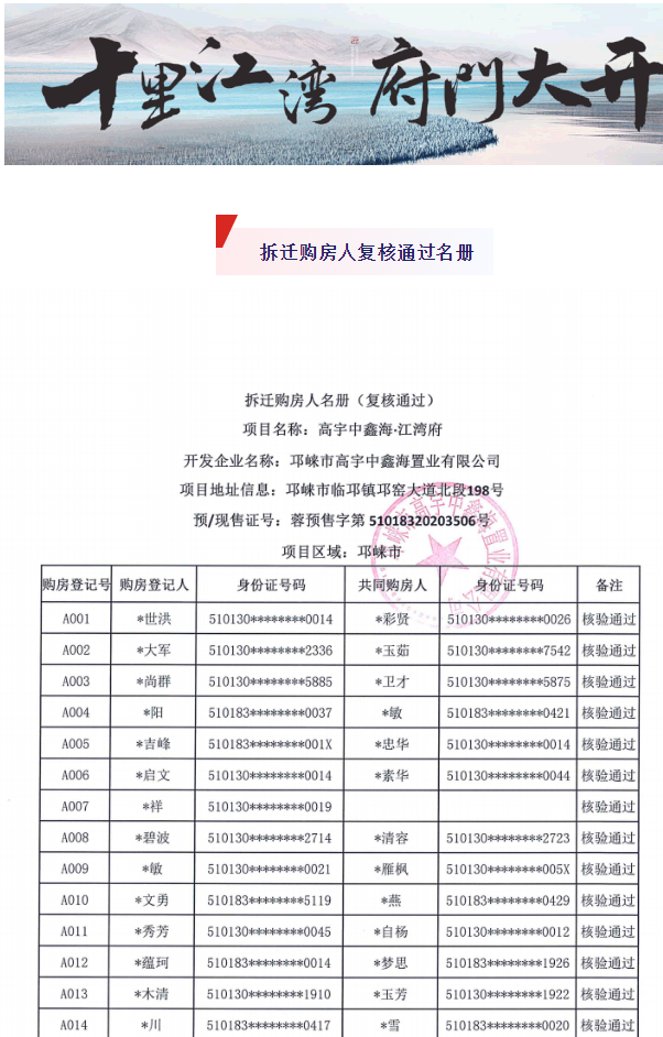 高宇中鑫海·江湾府8、9、10号楼拆迁购房人复核通过名单 |