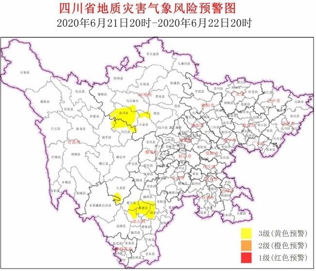 6月21日,省地质灾害指挥部办公室发布全省地质灾害气象风险预警。结合四川省气象台天气预报情况,6月21日20时~6月22日20时,阿坝州、甘孜州、凉山州部分地区为3级(黄色预警)。
