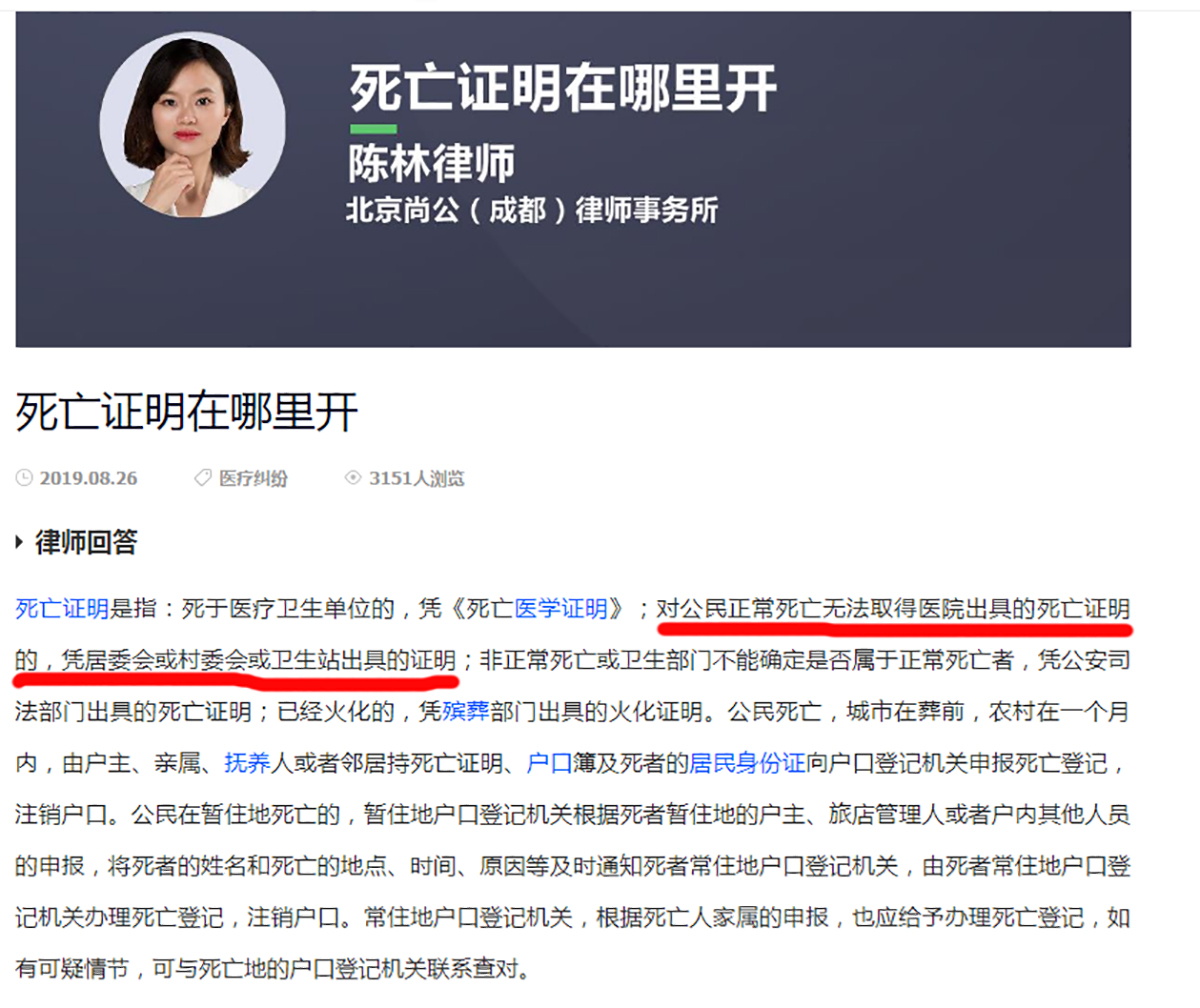 匿名者 发表于 2020-7-13 09:48 楼主应该打120或找签约的家庭医生出具死亡证明。社区出具死亡证明有点尴尬或不合法