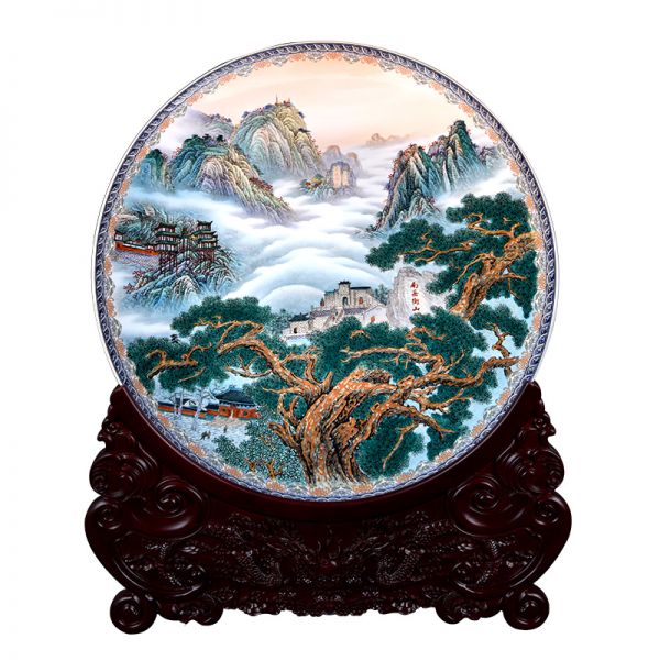 3、特制珍藏瓷《江山无限》大圆盘以青绿山水技法为主要表现形式,同时融合山石皴、擦、点、染、云海、断云等国画绘制技法,集陶瓷技法与国画技法大成于一身,还采用了落地粉彩、堆白等多种新型工艺制作,各处美景跃然圆盘上,如同站在山巅俯瞰全景,气势磅礴,无论是峻巍叠峰、深谷寒柯,还是萧寺掩映、板桥寒泉,都给人以强烈的视觉冲击力。