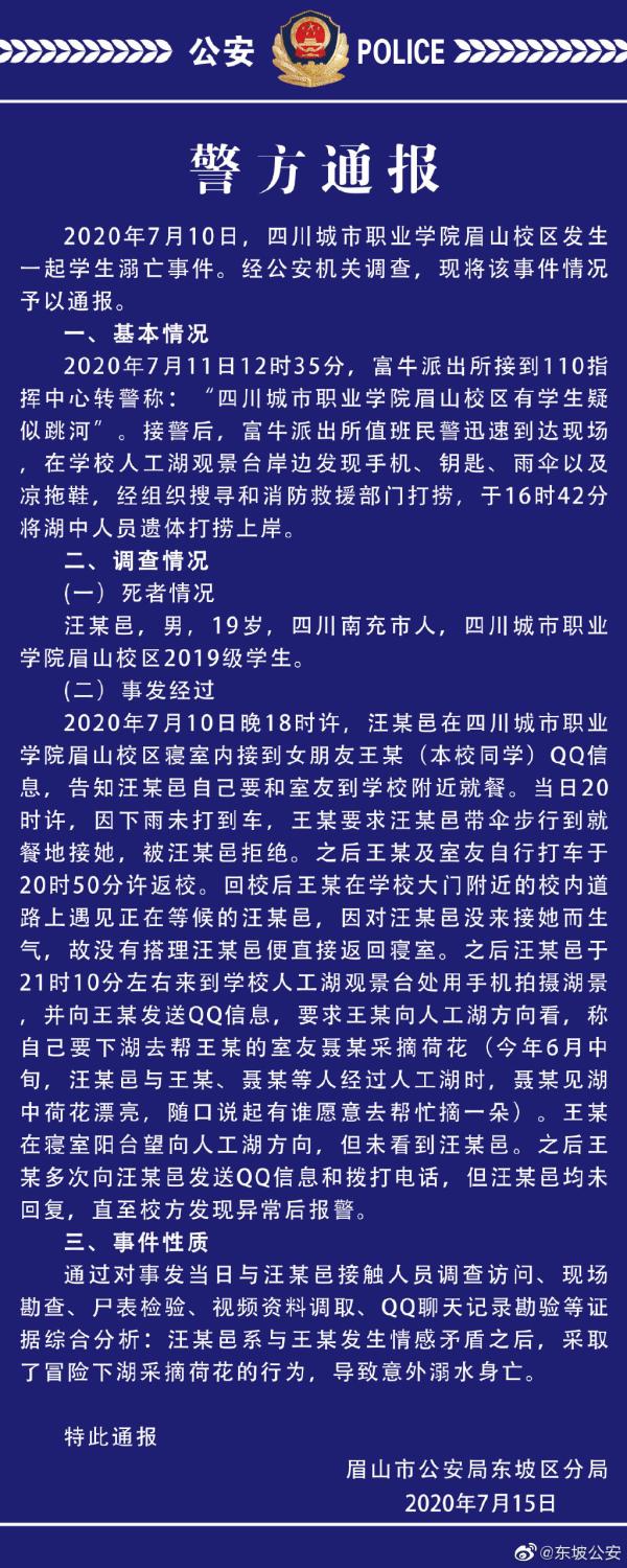 7月10日,四川城市职业学院眉山校区发生一起学生溺亡事件。经调查,警方通过对事发当日人员调查访问、现场勘查、尸表检验、视频资料调取、QQ聊天记录勘验等证据综合分析:死者系与女朋友发生情感矛盾后,采取了冒险下湖采摘荷花的行为,导致意外溺水身亡。