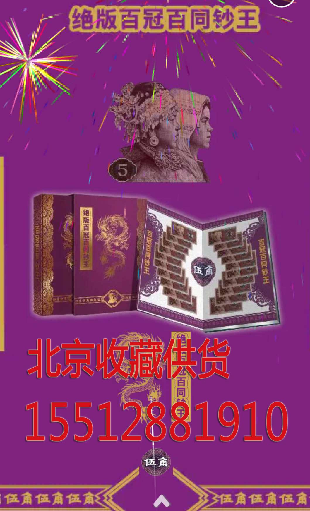 绝版百冠百同钞王收录了第四套人民币80版五角纸币共100枚,这100枚纸币有不同的一百个冠号,而后面的号码-模一样,全部同号,即百冠同号.也叫“百同号" .普通的二张同号钞纸币需要从1000万张人民币中寻找,已经是收藏者趋之若鹜的收藏之宝,100张全同号则只有十亿分之-的几率,收集难度极大。 更有极大的升值空间和收藏价值.