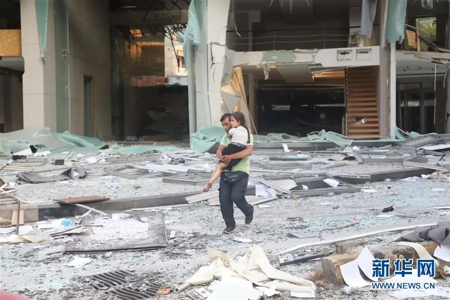 8月4日,在黎巴嫩首都贝鲁特,一名男子抱着孩子走过严重受损的建筑 初步统计显示,爆炸造成至少78人死亡、4000人受伤。因贝鲁特的医院收治能力有限,黎巴嫩卫生部长哈桑呼吁将伤亡人员分散至周边医院,同时号召所有医护人员参与救治伤员。 黎巴嫩总理证实,存放在港口仓库内的化学品硝酸铵发生了爆炸。